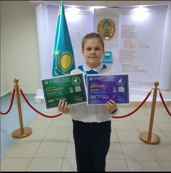 Ученица 4 класса "Б" Проценко Софья приняла активное участие в республиканском конкурсе Акбота -2023. Получила сертификат и диплом 1 степени. Поздравляем!