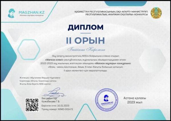 7 "А" сынып оқушысы Байкина Каролина Оқу-ағарту министрлігінің 514 бұйрығына сүйене "Мағжан әлемі" республикалық журналы ұйымдастыруымен өткен "Мағжан оқулары" конкурсы…