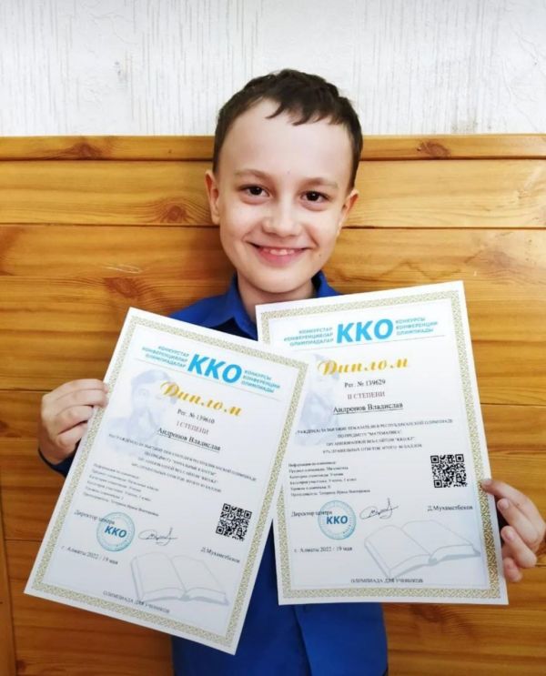 Поздравляем ученика 1 Г класса Андронова Владислава с занятыми первым и вторым местом в Республиканской олимпиаде по начальным классам и по математике.
