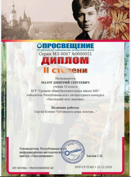 Ученик 10 "Д" класса Гарипулаев Адиль награждён Дипломом 1 степени, стал победителем Республиканского литературного конкурса "Последний поэт деревни".