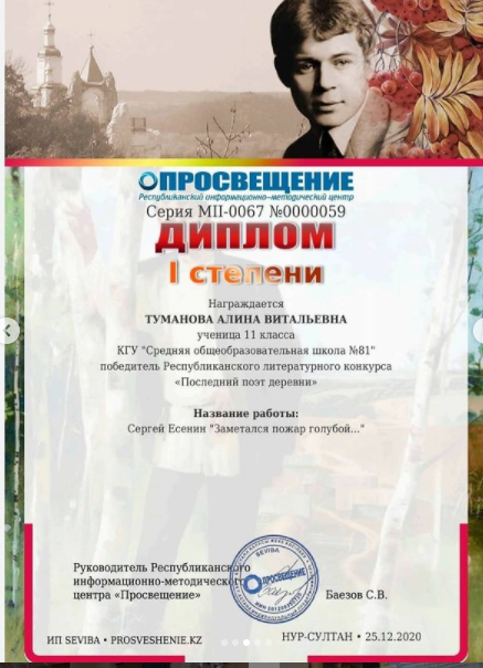 Ученица 10 класса КГУ "СОШ 81" Акбарова Аяжан стала победителем Республиканского литературного конкурса " Последний поэт деревни". Сергей Есенин " Ты меня не любишь, не жале…