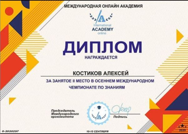 Ученик 7 "А" класса Костиков Алексей занял ІІ место в осеннем международном чемпионате по знаниям. ПОЗДРАВЛЯЕМ! #диплом #знание #международнаяонлайнакадемия