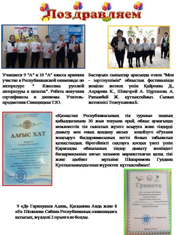 Сегодня в школе проходят торжественные линейки по чествованию призеров школьного тура Республиканской олимпиады по 15 общеобразовательным предметам для учащихся 8-11 классов и 5-7 классов.Для старше…