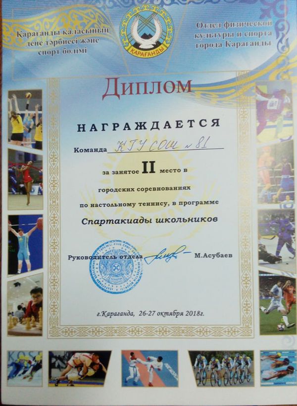 26.10.2018 жылы №81 ЖББОМ базасында қалалық Спартакиада бағдарламасы бойынша қалалық үстел теннисінен жарыс болып өтті. Біздің команда ІІ орын алды, құттықтаймыз! 1 орын-№3 гимназия 2 орын -№81…