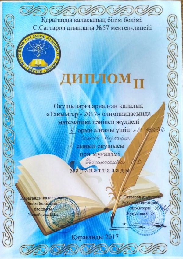 Оқушыларға арналған қалалық "Танымгер-2017" олимпиадасында математика пәнінен жүлделі II орын алғаны үшін № 81 ЖББОМ Саятов Нұрсайын 4 сынып оқушысы пән мұғалімі Рахимж…
