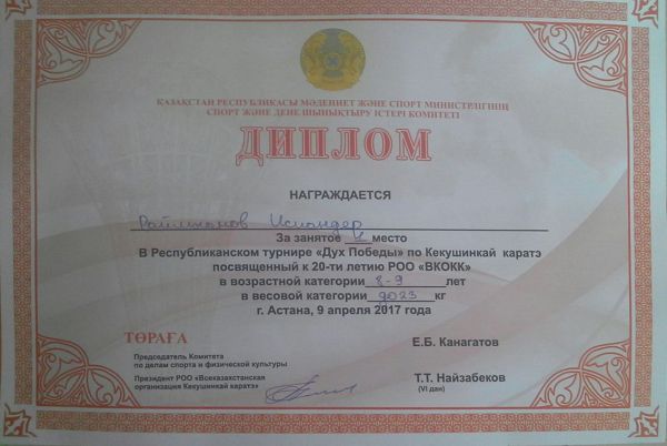 Астана қаласында өткен "Рухтың жеңісі" атты Республикалық турнир Кекушин каратэдан мектебіміздің оқушысы Раймхан Испандер І орын алды.