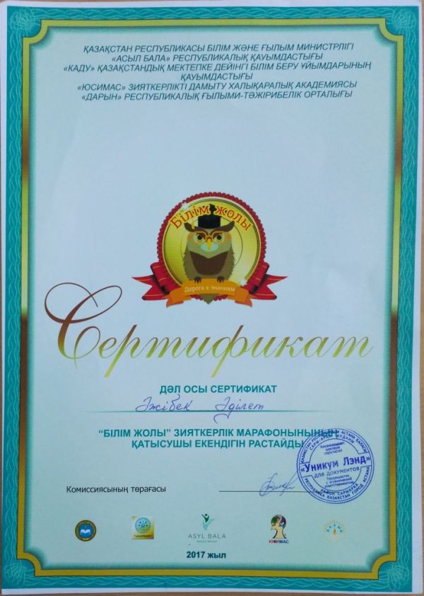 Мектебіміздің оқушылары "Білімге жол" атты интеллектуалдық марафонға қатысты. "Білімге жол" атты интеллектуалды марфонға қатысқандары үшін сертификат алды.