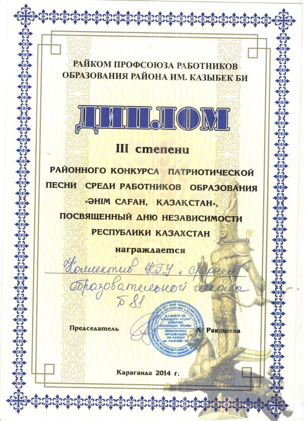 18.12.2014 г. на базе СОШ №86 среди работников образования проходил районный конкурс патриотической песни. Коллектив нашей школы занял 3-место.