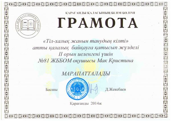 IV қалалық "Менің ұстазым" шығармашылық жұмыстар байқауында I орын иеленгені үшін №81 орта мектептің 9 сынып оқушысы Жулдызов Айхан.
