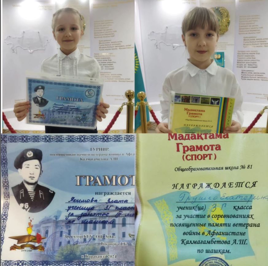 Поздравляем учениц 3 Г класса Якимову Злату, за занятое 3 место, и Грушко Екатерину, с грамотой за участие, в соревнованиях по шашкам, посвященных памяти ветерана войны в Афганистане Калмагамбетова…