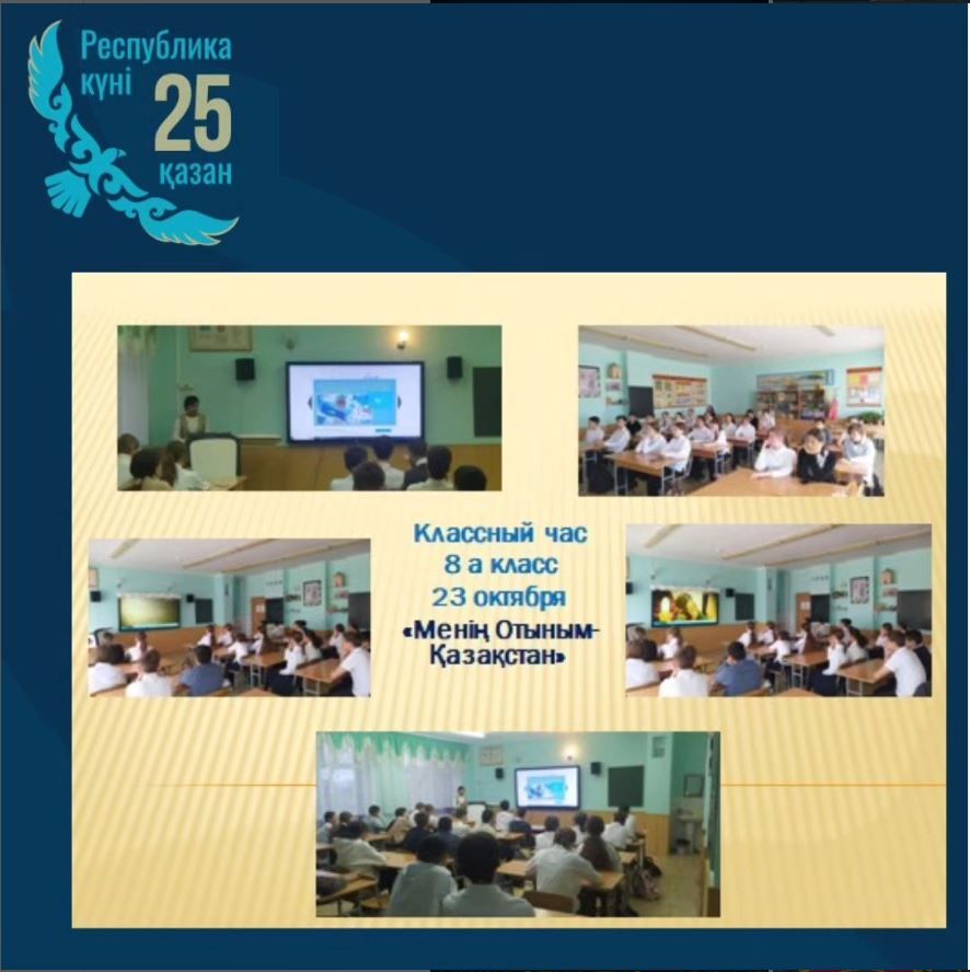 23 октября в 8 "А" классе прошел классный час по теме: "Менің Отыным- Қазақстан", приуроченный к 25 октября- Дню Республики. День Республики -один из главных государственных праз…