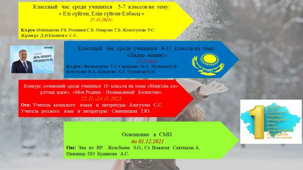 Тұңғыш президент күніне орай 11 "А" сынып оқушылары  сынып сағатын өткізді.  Сын жетекшісі: Туркенова Б.М.