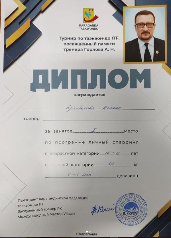 Поздравляем Арчибасову Ксению, ученицу 7В класса за занятое 1 место в соревнованиях по таэквон-до ITF.