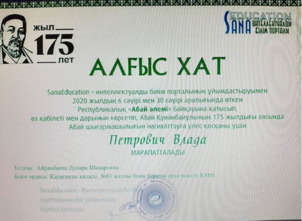 За участие в республиканском конкурсе " Абай әлемі", который прошёл с 6 апреля по 30 апреля 2020 года, награждена "Благодарственным письмом" ученица 2 «Е» класса П…
