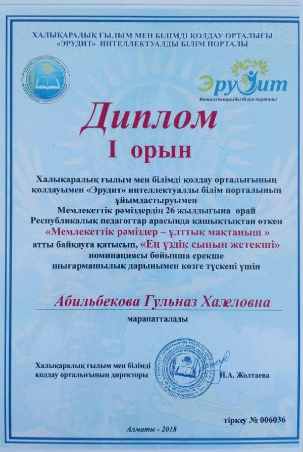 6 "Д" сыныбының сынып жетекшісі Абильбекова Гульназ Халеловнаны "Мемлекеттік рәміздер-ұлттық мақтанышымы" Республикалық Эрудит конкурсында "Ең үздік сынып жетекші"…