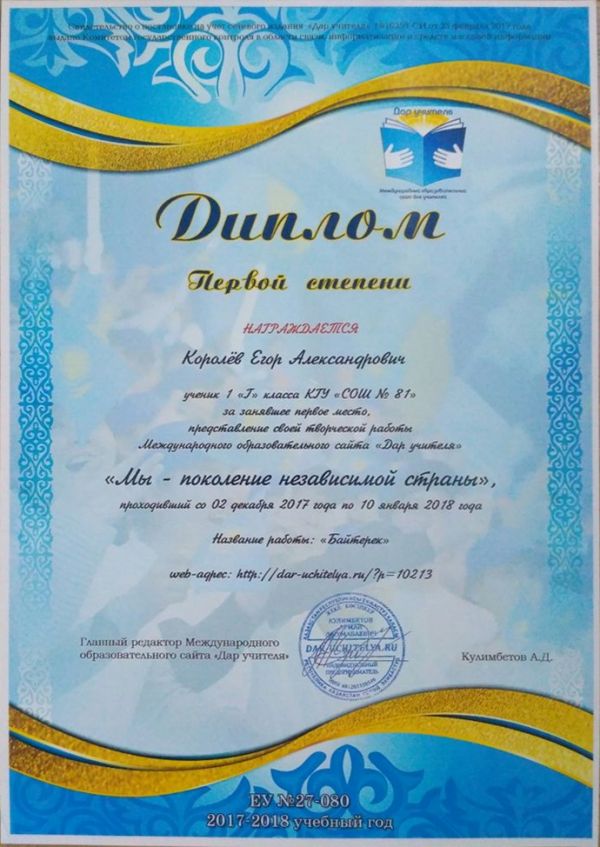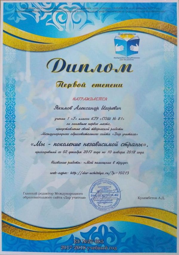 1 «Г» және 1 «F» сынып оқушыларын «Мұғалімнің сыйы» Халықаралық білім беру сайтына өздерінің шығармашылық жұмыстарын ұсынғандары үшін 1 дәрежелі дипло…
