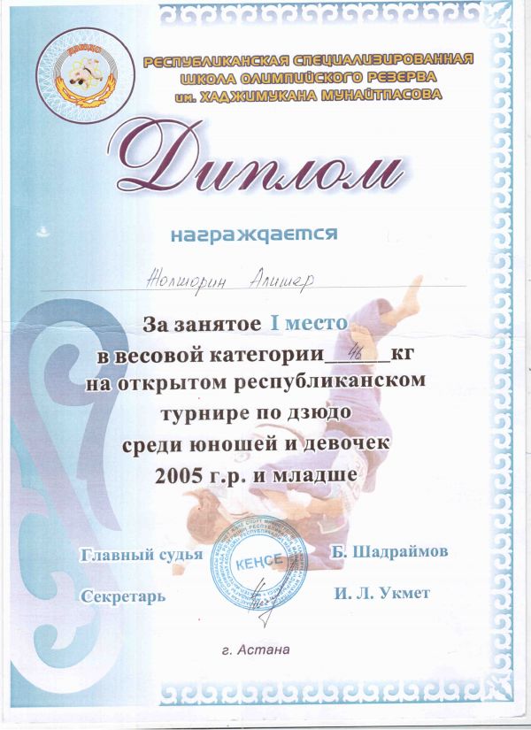Ашық біріншілікте 2005 жылғы қыздар мен ұлдар арасында 46 кг салмақта дзюдодан Жолшорин Алишерді І орын алғаны үшін құттықтаймыз.