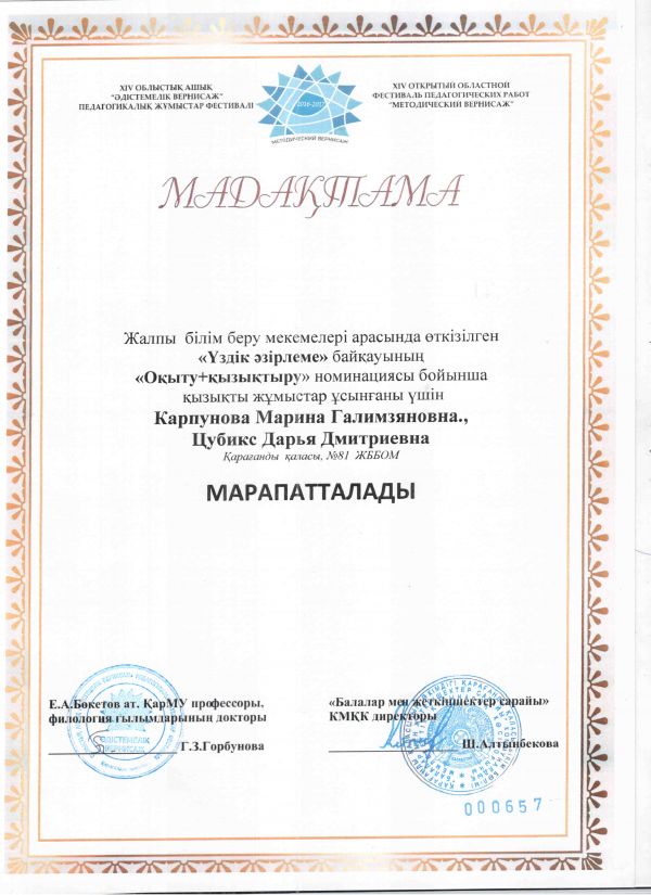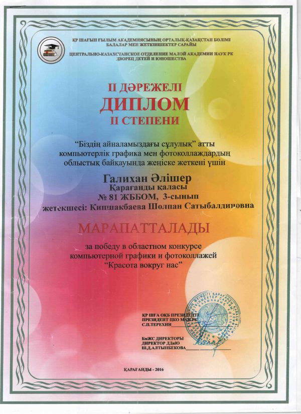 "Сұлулық біздің айналамызда" атты фотоколлаж және компьютерлік графикадан облыстық сайысқа қатысқаны үшін Галихан Алишерді құттықтаймыз.