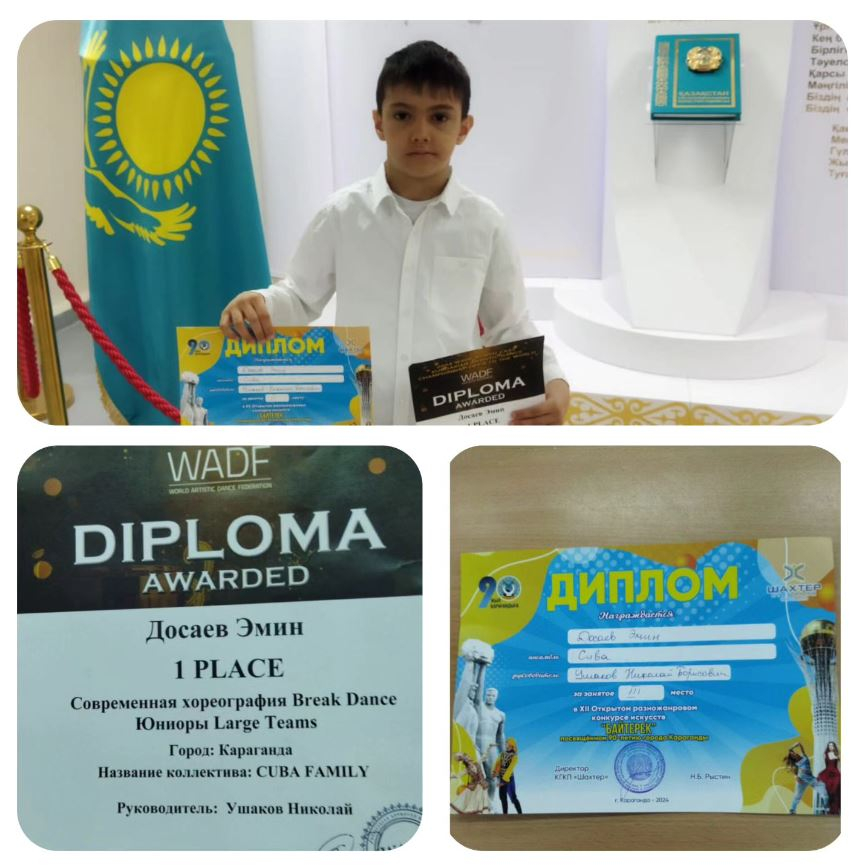 Ученик 1Г класса, Досаев Эмин, награждается дипломом за занятое 3 место в 12 Открытом разножанровом конкурсе искусств "Байтерек", посвящённом 90- летию города Караганды. Поздравляем