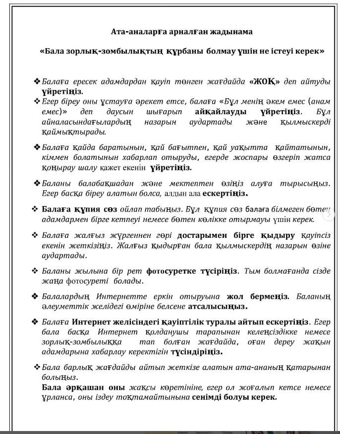 Балаларға арналған жадынама «Зорлық-зомбылықтың құрбаны болмауы үшінне істеу керек»…