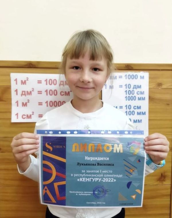 Поздравляем ученицу 2 Г класса Лукьянову Василису с занятым первым местом в республиканской олимпиаде по математике.