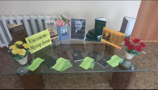 Қазіргі қазақ әдебиетінінің негізін қалаушы, жазушы, ұлы классик ақын Мұхтар Омарханұлы Әуезовтың туғанына 125 жыл толуына орай мектеп кітапханасында «Ұлы қлассик - Мұхтар Әуезовтің туғанына 1…