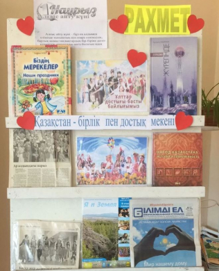 Мектеп кітапханасында 1 -наурыз Алғыс айту күніне арналған "Қазақстан- бірлік пен достық мекені" атты кітап көрмесі ұйымдастырылды.