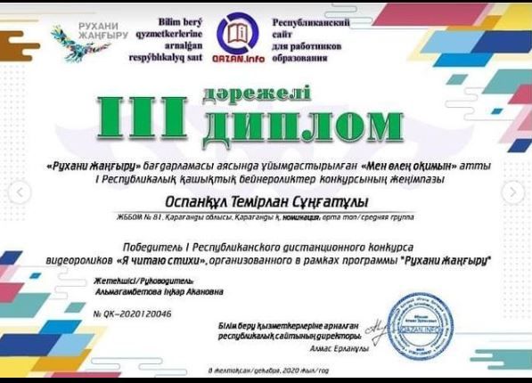 Рухани жаңғыру аясында өткен "Мен өлең оқимын" атты 1 Республикалық қашықтан ұйымдастырылған бейнероликтер байқауына қатысып 5"Ә" сынып оқушысы Нұрланова Әнел 2 дәрежелі дипломм…