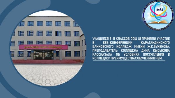 Учащиеся 9-11 классов СОШ 81 приняли участие в веб-конференции Карагандинского Банковского колледж имени Ж.К.Букенова. Преподаватель колледжа Дина Кысыкова рассказала об условиях поступления в колле…
