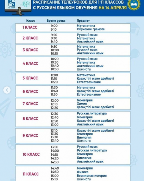 14 сәуірдегі телесабақтардың кестесі Сіздерге ыңғайлы болуы үшін "BALAPAN" арнасынан көрсетілетін телесабақ кестелерін күнделікті жариялап отырамыз. Расписание телеуроков на 14 апреля…