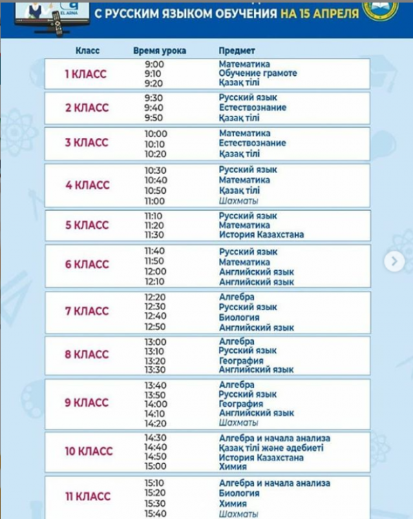 15 сәуірдегі телесабақтардың кестесі Сіздерге ыңғайлы болуы үшін "BALAPAN" арнасынан көрсетілетін телесабақ кестелерін күнделікті жариялап отырамыз. Расписание телеуроков на 15 апреля Д…