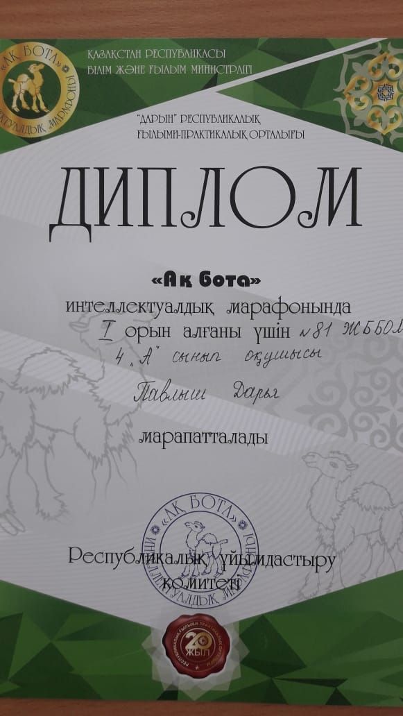 Поздравляем учеников 4 "А"класса за занятые призовые места в Республиканском интеллектуальном конкурсе " Ақ бота"