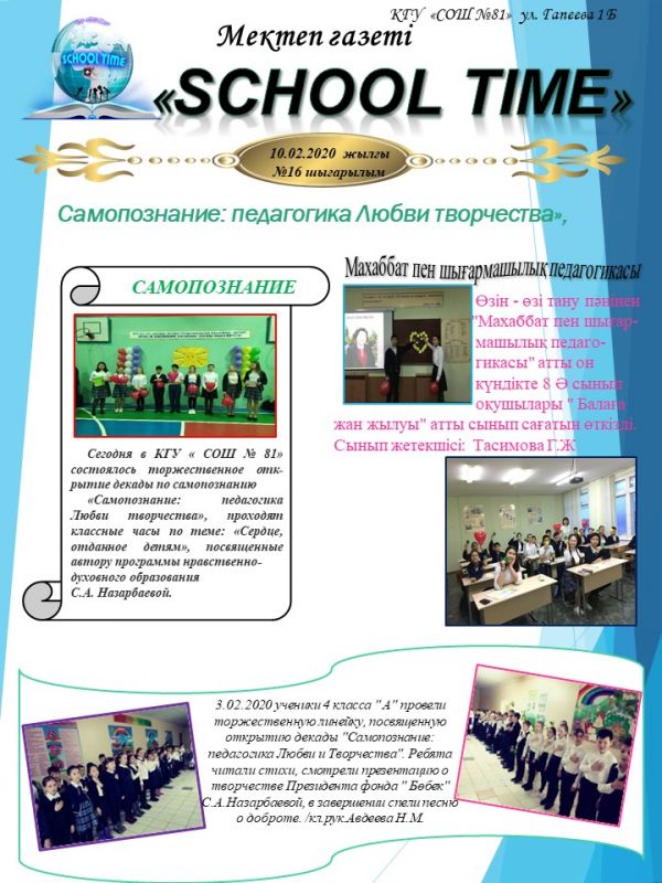 "SCHOOL TIME" газетінің № 16 шығарылымы.
