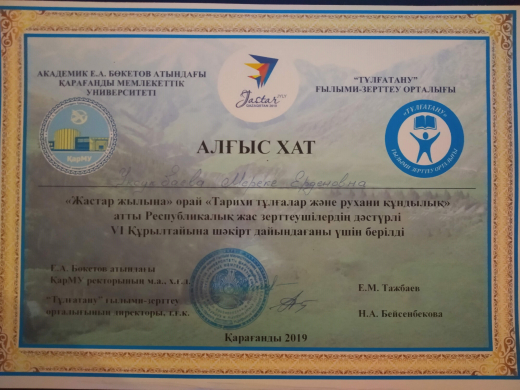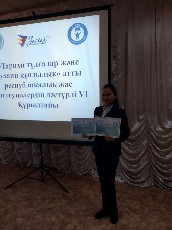 «Жастар жылына» орай «Тарихи тұлғалар және рухани құндылық» атты Республикалық жас зерттеушілердің дәстүрлі VIҚұрылтайына 9 «Б» сынып оқушысы Асылбеко…