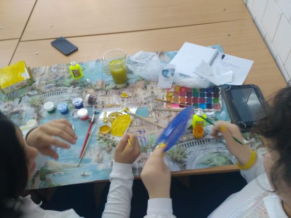 На уроке художественного труда учащиеся 7 «В» класса работали в группах и рисовали рисунки на тему «День Первого Президента Республики Казахстан»