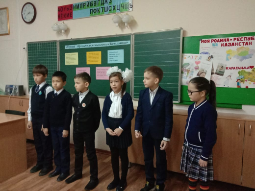 Сегодня в 3 " В" классе прошел кл.час ко дню Первого Президента Республики Казахстан и учащиеся 3 В класса приняли активное участие.