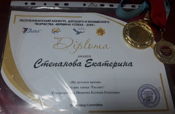 Награждена дипломом 1 степени ученица 1 Е класса Степанова Екатерина Максимовна. За участие в конкурсе по танцам.