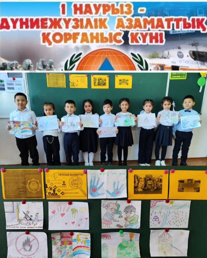 1- наурыз Дүниежүзілік Азаматтық қорғаныс күні. 1"Е" сынып оқушылары "Біз қауіпсіз әлем үшін" тақырыбында суреттер салды.