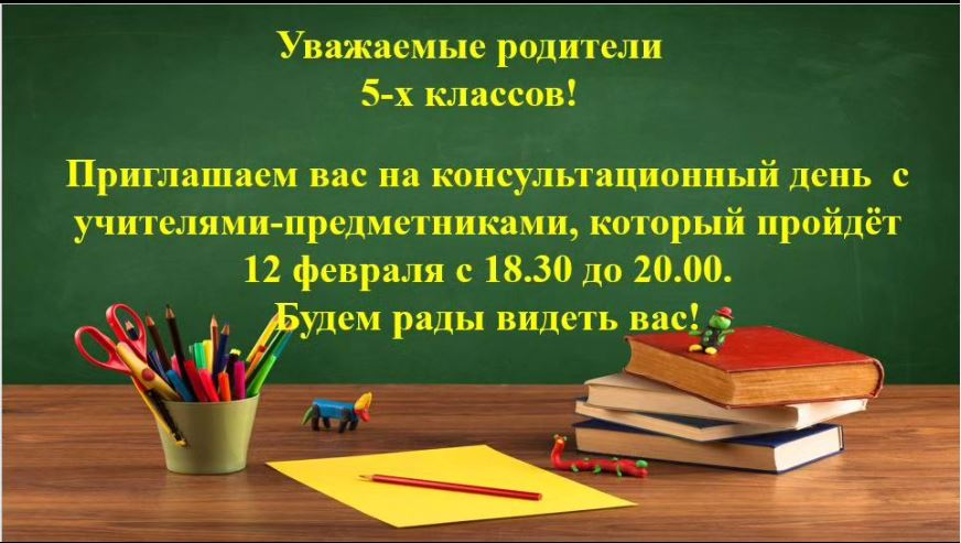 Уважаемые родители 5-х классов! Приглашаем вас на консультационный день с учителями-предметниками, который пройдёт 12 февраля с 18.30 до 20.00. Будем рады видеть вас!