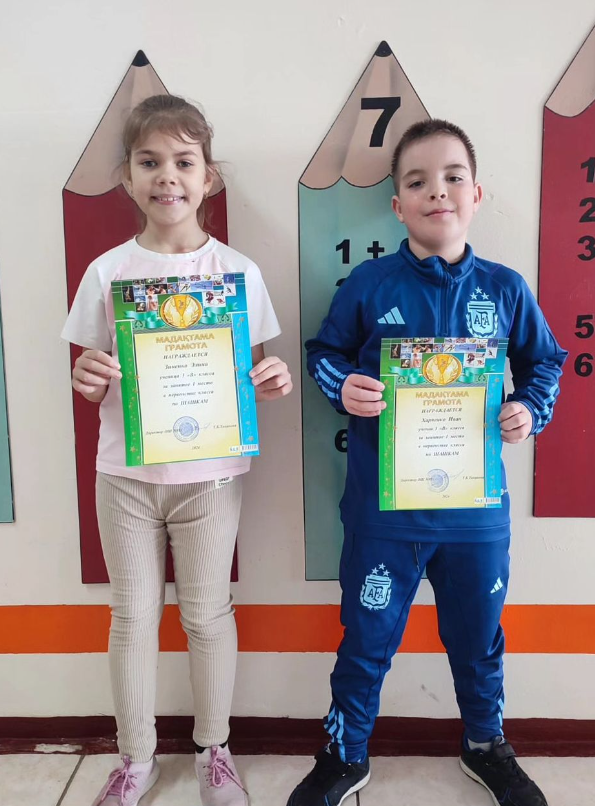 Поздравляем Зиненко Элину и Харченко Ивана, учеников 3В класса за занятое 1 место в первенстве класса по ШАШКАМ.