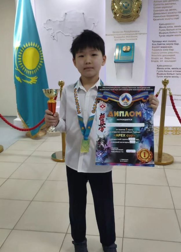 Поздравляем ученика 3б класса Айтуганова Исахана с победой и 1 местом в открытом межклубном кубке кекушинкай карате.