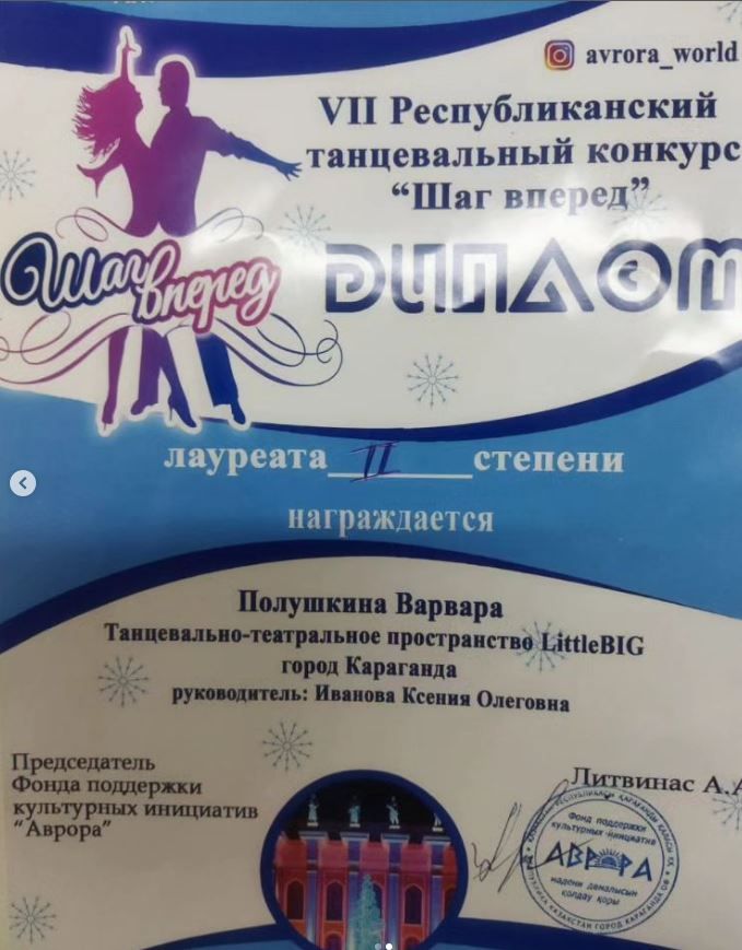 Поздравляем ученицу 3 Г класса Полушкину Варвару с получением диплома 2 степени в Республиканском танцевальном конкурсе.