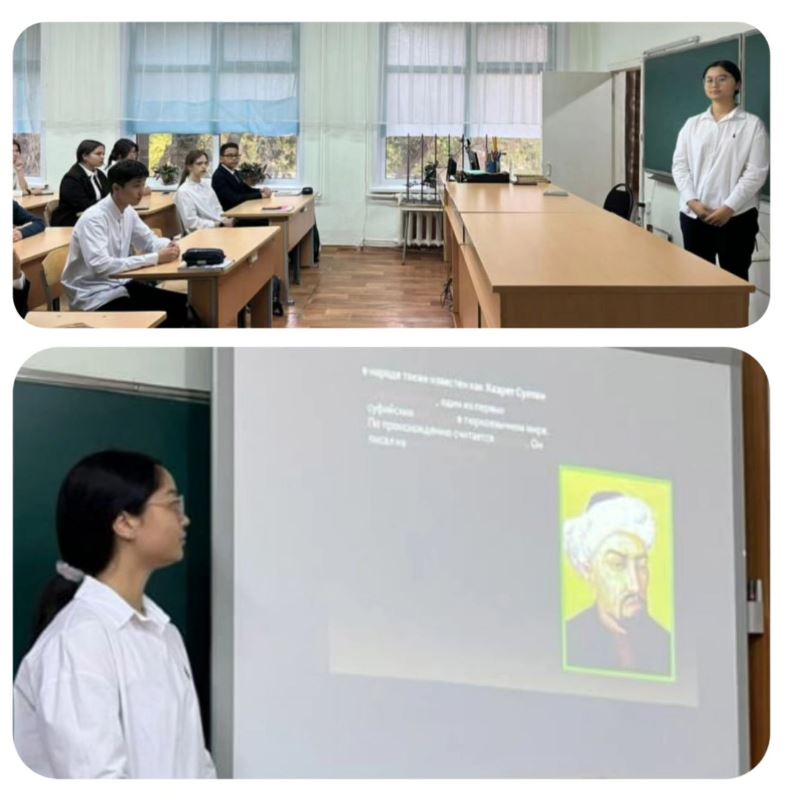 Сегодня 25 сентября в 10 «Б» классе прошел классный час,на тему ««Учение мудрости Кожа Ахмета Ясауи» 930 лет со дня рождения Кожа Ахмета».