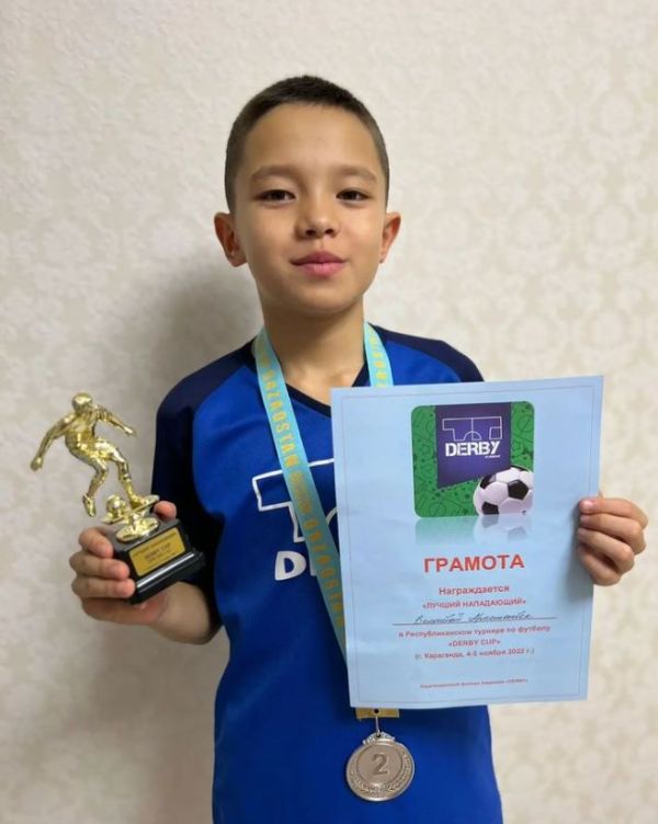 Ученик 7В класса Бельгибай Арыстанбек получил номинацию "Лучший нападающий" в республиканском турнире по футболу "Derby Cup"