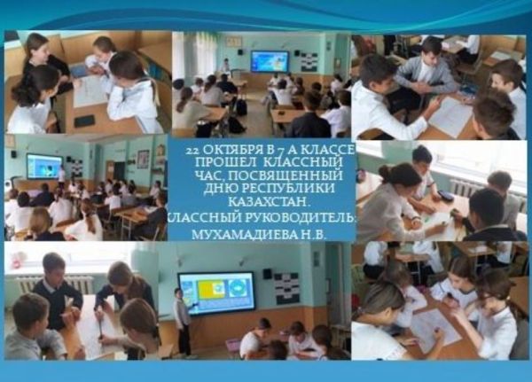 22 октября в 7 А классе прошел классный час на тему: "Қазақстаным-мақтанышым". Классный руководитель: Мухамадиева Н.В.