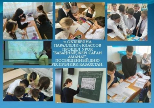 21 октября на параллели 7 классов прошел урок, посвященный Дню Республики Казахстан на тему: "Бабаңның жері-саған аманат". Ответственный: учитель истории Мухамадиева Н.В.