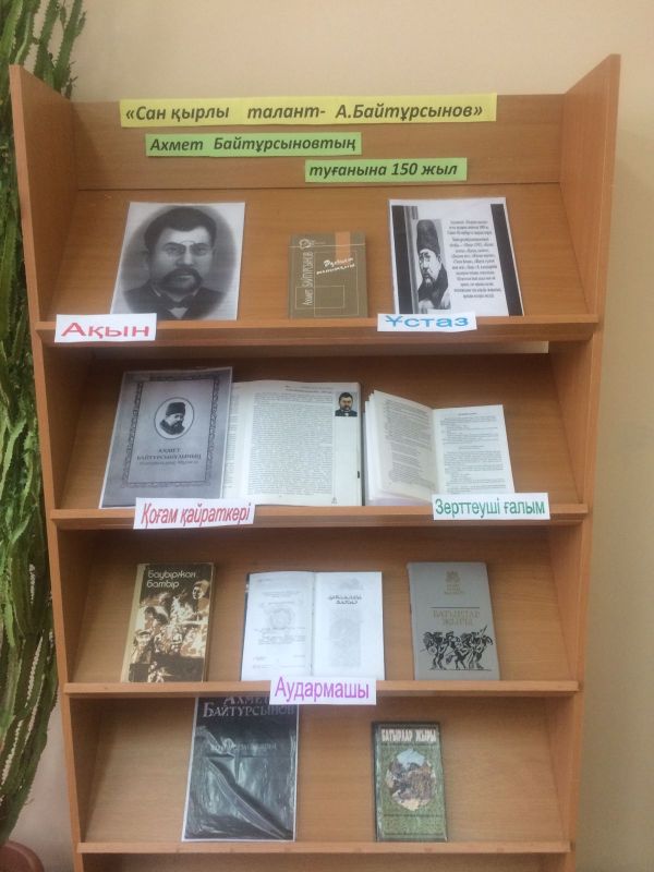 Мектеп кітпханасында Ахмет Байтұрсыновтың 150 жыл толуына орай "Сан қырлы талант - А. Байтұрсынов" атты кітап көрмесі ұйымдастырылды.