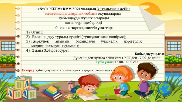 «№ 81 ЖББМ» КММ 2021 жылдың 31 тамызына дейін мектеп алды даярлық тобына оқушыларды қабылдауды жүзеге асырады қағаз түрінде берілді