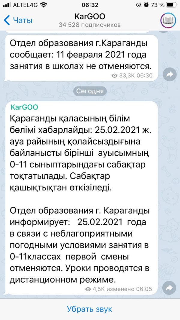 Қарағанды қаласының білім бөлімі хабарлайды: 25.02.2021 ж. ауа райының қолайсыздығына байланысты бірінші ауысымның 0-5 сыныптарындағы сабақтар тоқтатылады. Сабақтар қашықтықтан өткізіледі.