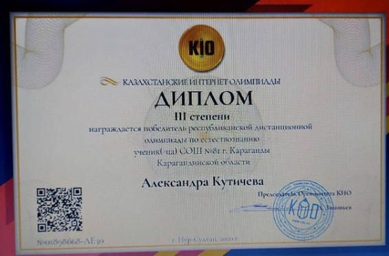 Дипломом III степени награждется победитель КИО республиканской дистанционной олимпиады по естествознанию
